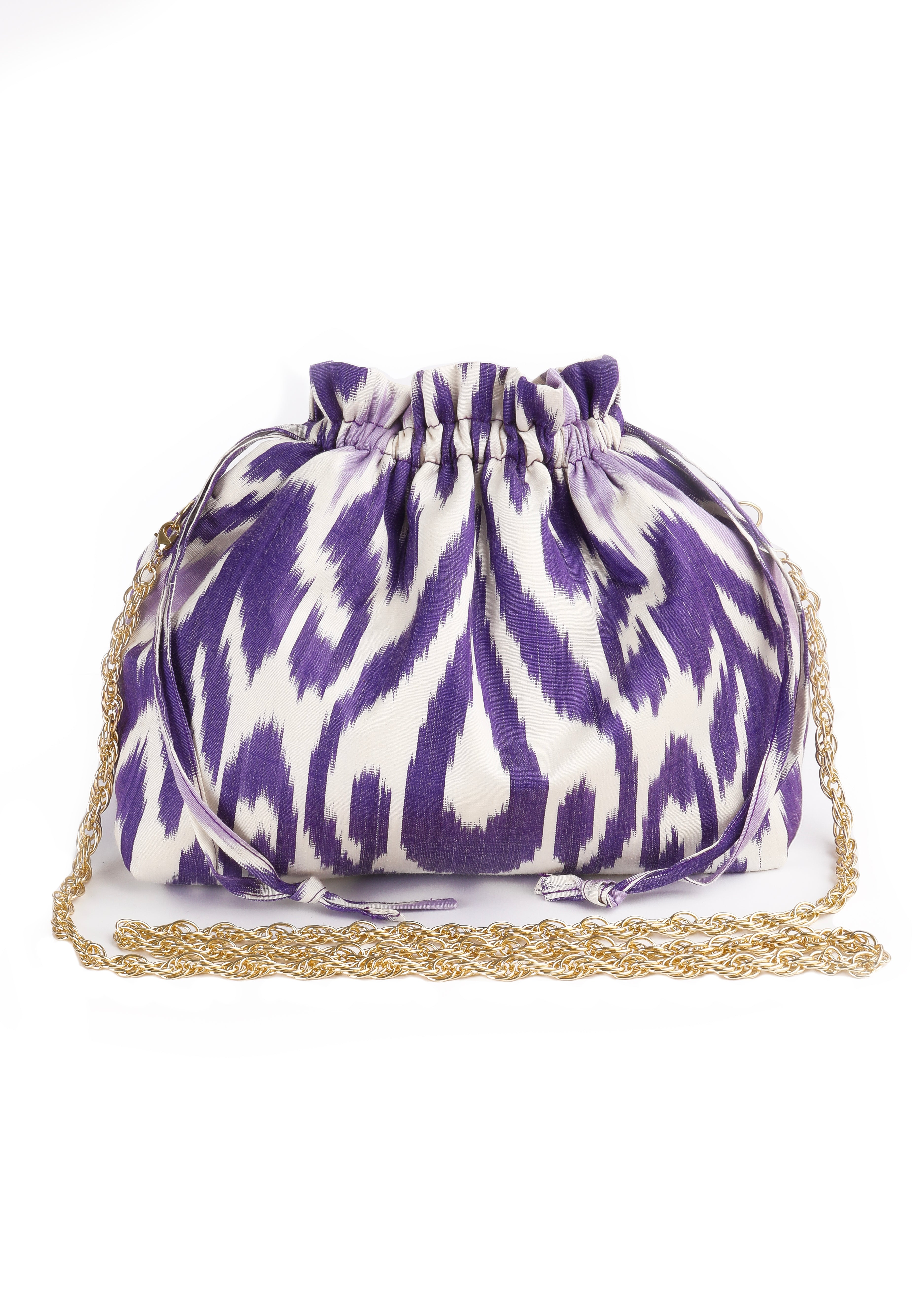 Carry your party purse with its chic cinch straps on your arm or wrist, OR be footloose and hands-free with our luxe gold cross-body chain.